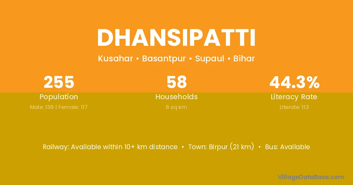 Birpur (21 km) is the nearest town to Dhansipatti village for major economic activities and is located approximately 21 km away.