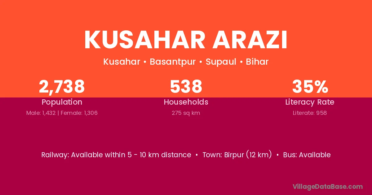 Kusahar Arazi village has a total population of 2,738 people, of which 1,432 are males and 1,306 are females.