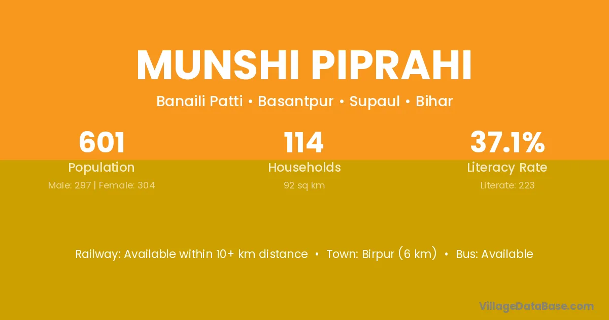 Munshi Piprahi village has a total population of 601 people, of which 297 are males and 304 are females.
