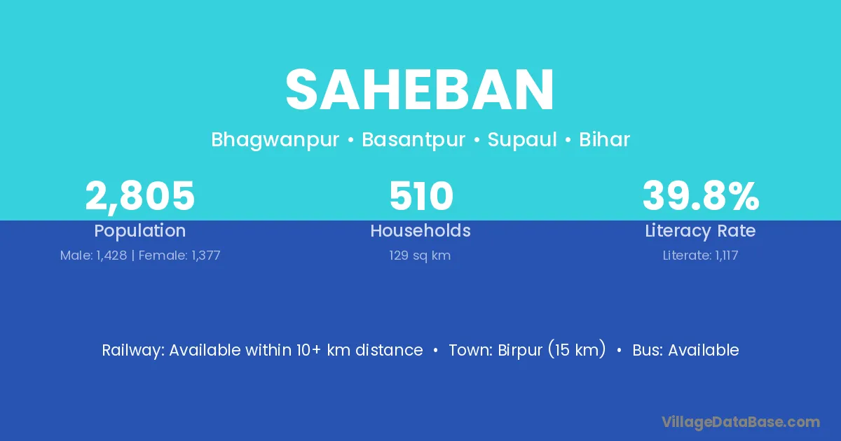 Birpur (15 km) is the nearest town to Saheban village for major economic activities and is located approximately 15 km away.
