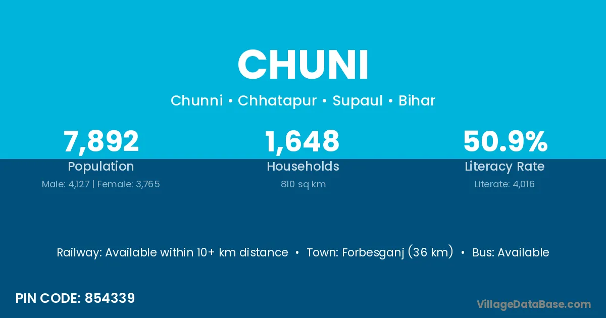 Forbesganj (36 km) is the nearest town to Chuni village for major economic activities and is located approximately 36 km away.