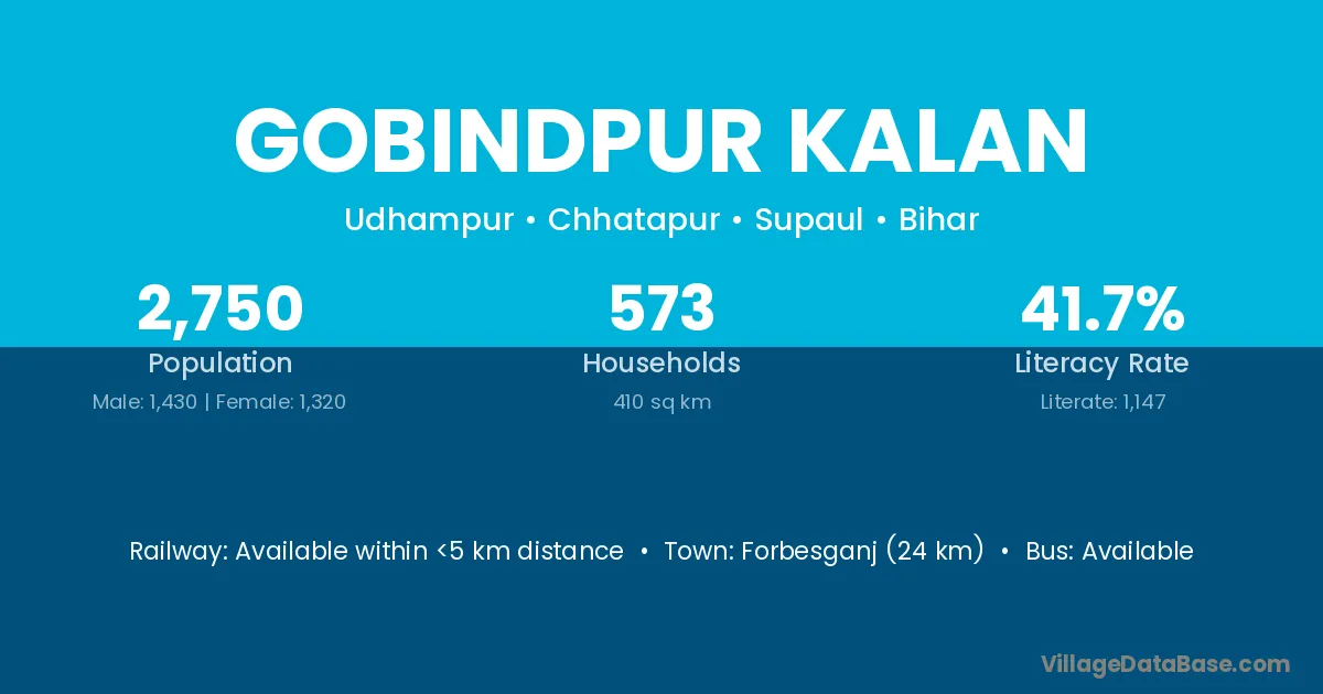 Forbesganj (24 km) is the nearest town to Gobindpur Kalan village for major economic activities and is located approximately 24 km away.