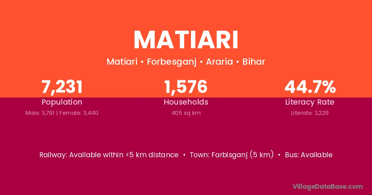 Birpur (20 km) is the nearest town to Matiari village for major economic activities and is located approximately 20 km away.