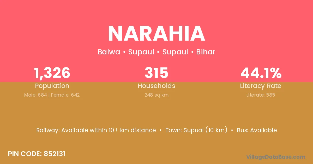 Forbesganj (45 km) is the nearest town to Narahia village for major economic activities and is located approximately 45 km away.