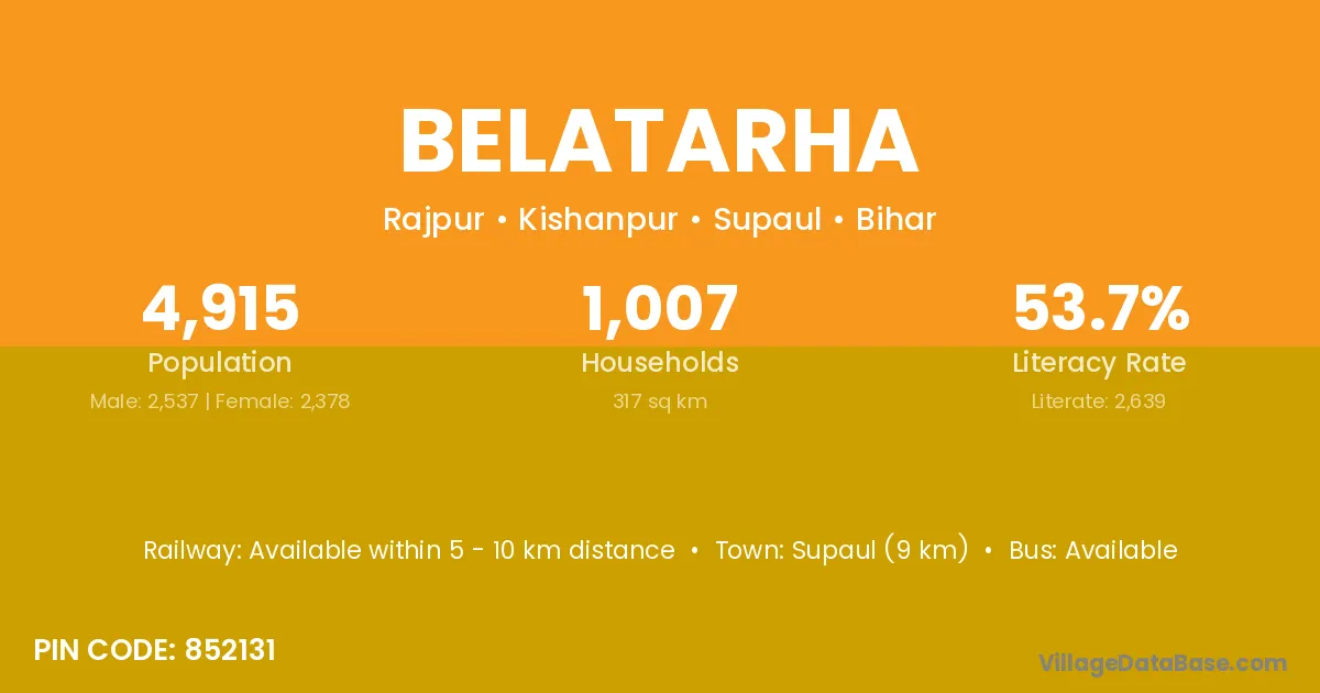 Supaul (9 km) is the nearest town to Belatarha village for major economic activities and is located approximately 9 km away.