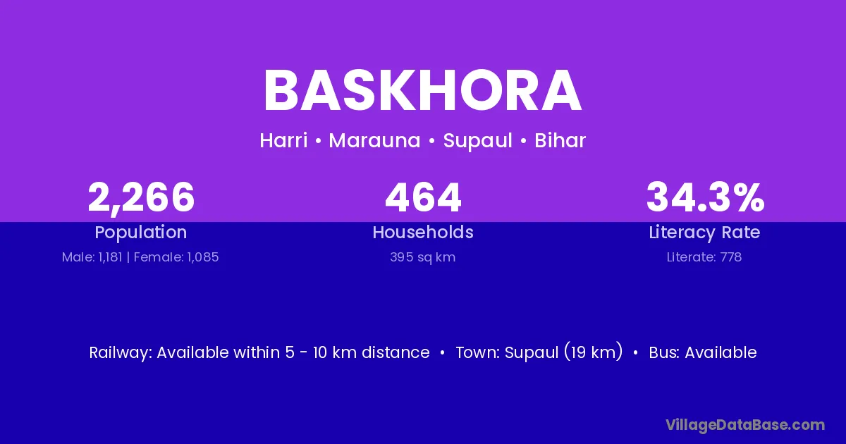 Supaul (19 km) is the nearest town to Baskhora village for major economic activities and is located approximately 19 km away.