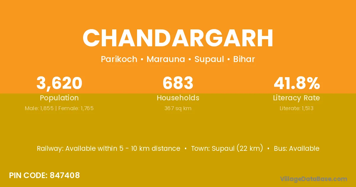 Supaul (22 km) is the nearest town to Chandargarh village for major economic activities and is located approximately 22 km away.