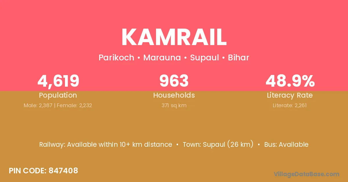 Supaul (26 km) is the nearest town to Kamrail village for major economic activities and is located approximately 26 km away.