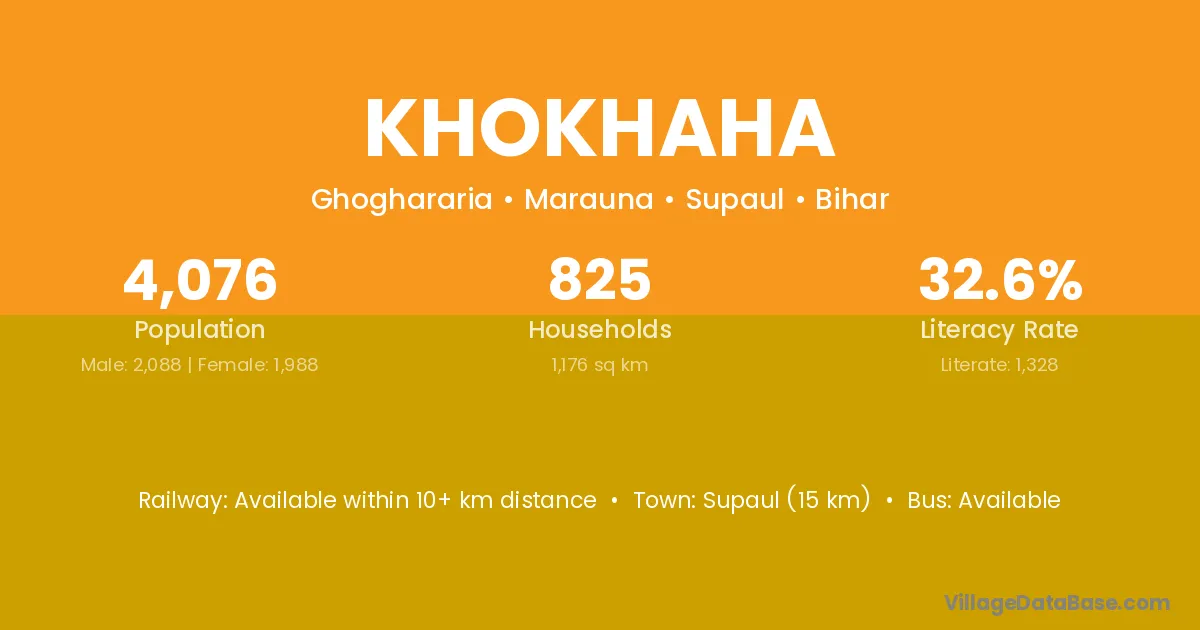 Supaul (15 km) is the nearest town to Khokhaha village for major economic activities and is located approximately 15 km away.
