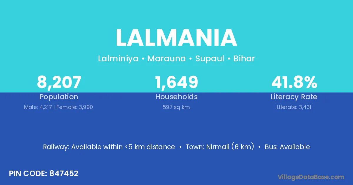 Nirmali (6 km) is the nearest town to Lalmania village for major economic activities and is located approximately 6 km away.