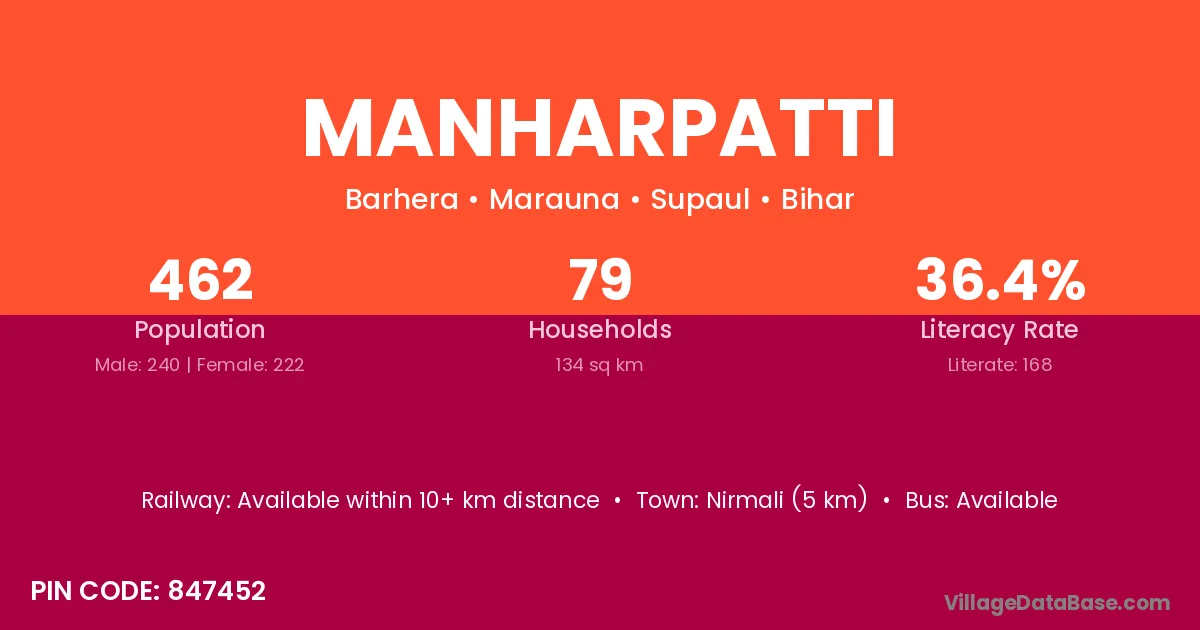 Manharpatti village has a total population of 462 people, of which 240 are males and 222 are females.