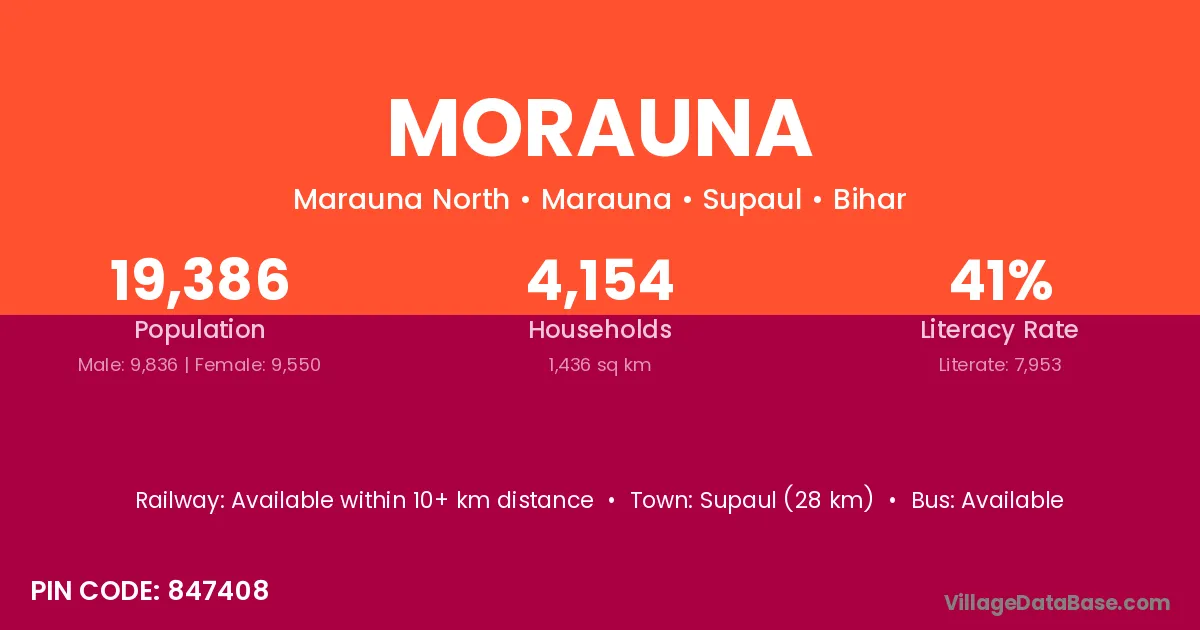 Supaul (28 km) is the nearest town to Morauna village for major economic activities and is located approximately 28 km away.