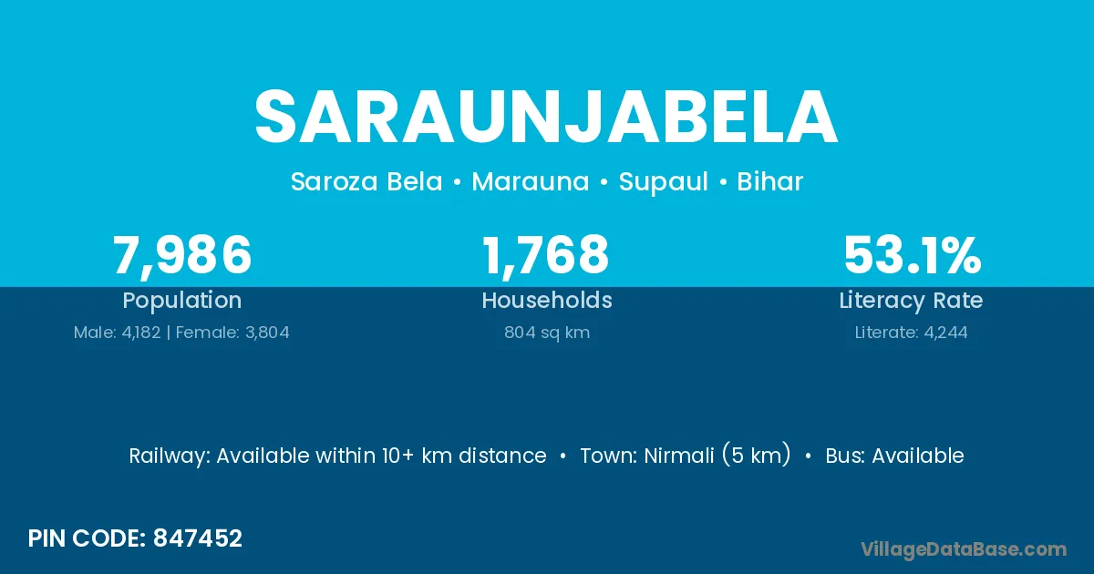 Nirmali (5 km) is the nearest town to Saraunjabela village for major economic activities and is located approximately 5 km away.