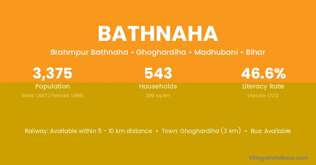 Nirmali (33 km) is the nearest town to Bathnaha village for major economic activities and is located approximately 33 km away.