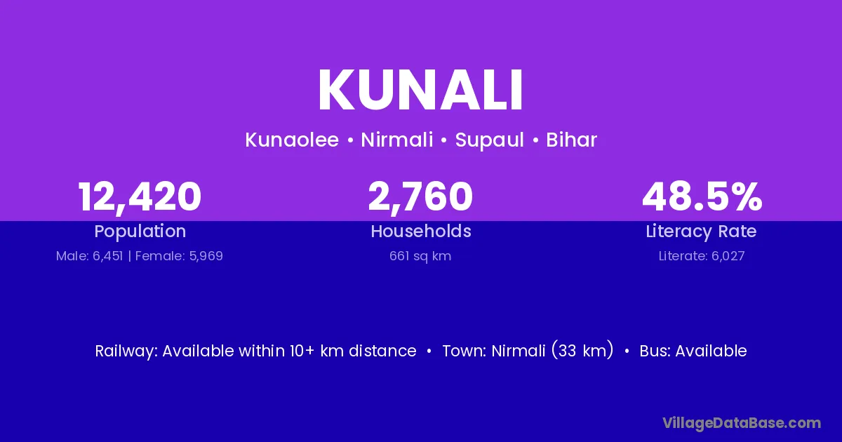 Nirmali (33 km) is the nearest town to Kunali village for major economic activities and is located approximately 33 km away.