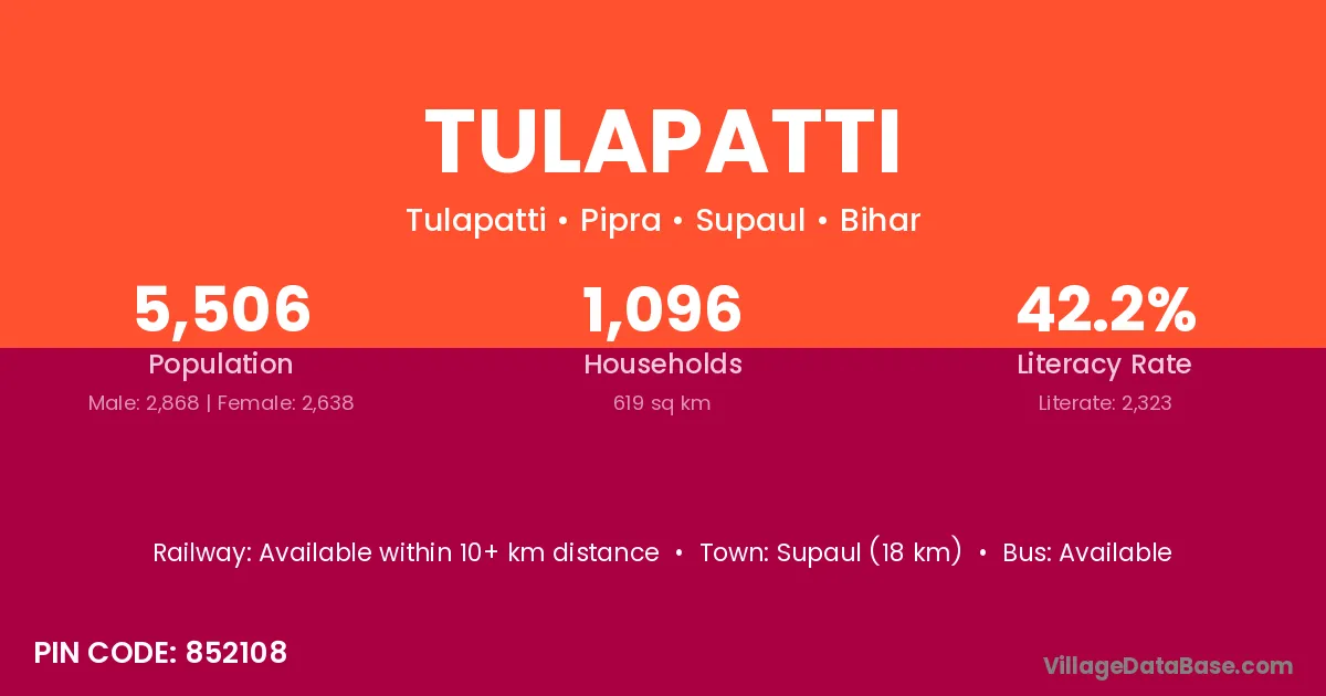 Supaul (18 km) is the nearest town to Tulapatti village for major economic activities and is located approximately 18 km away.