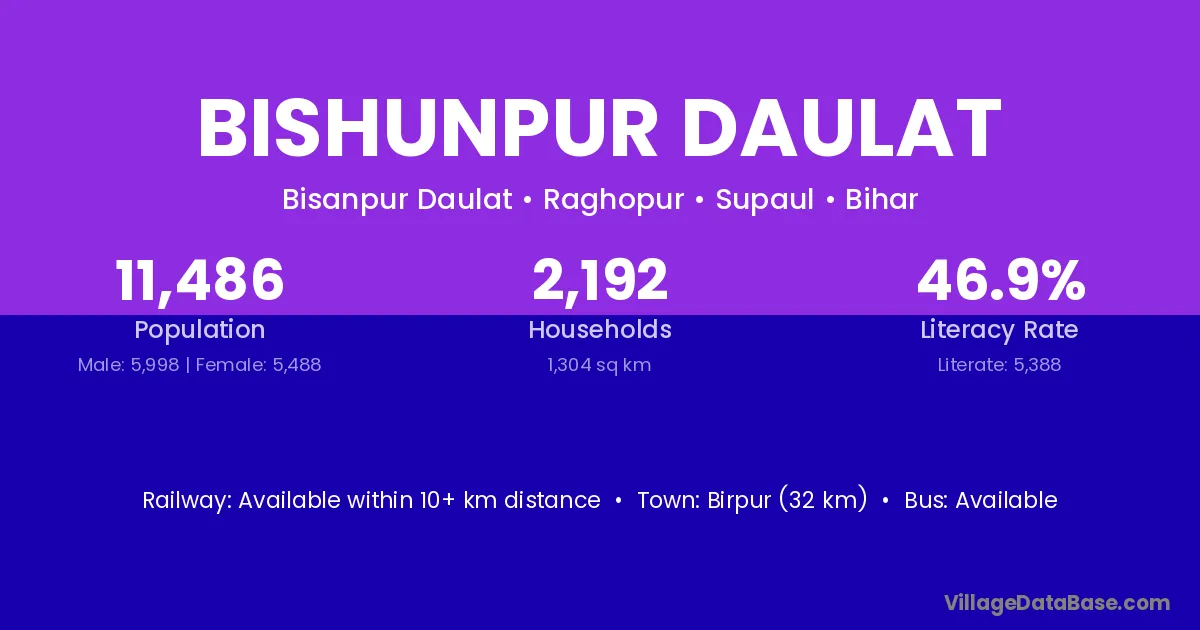 Birpur (32 km) is the nearest town to Bishunpur Daulat village for major economic activities and is located approximately 32 km away.