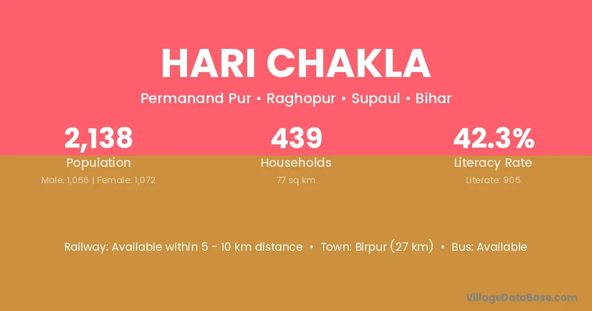 Birpur (27 km) is the nearest town to Hari Chakla village for major economic activities and is located approximately 27 km away.