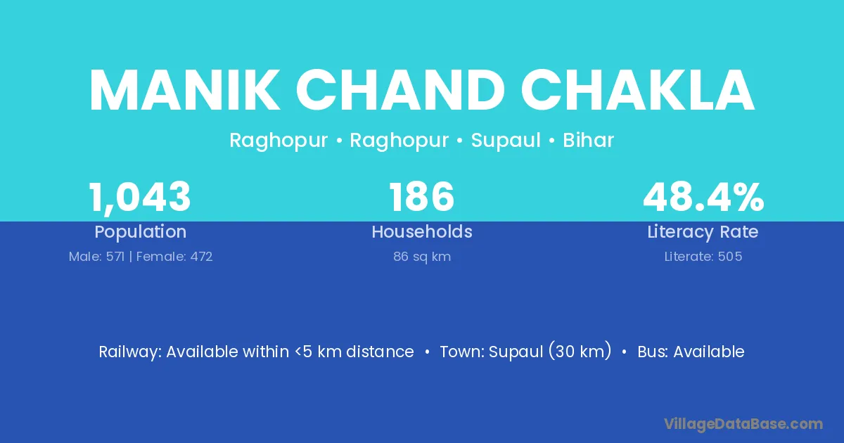 Supaul (30 km) is the nearest town to Manik Chand Chakla village for major economic activities and is located approximately 30 km away.