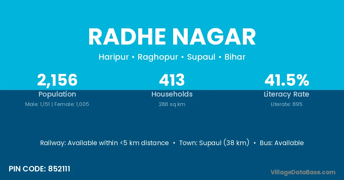 Supaul (38 km) is the nearest town to Radhe Nagar village for major economic activities and is located approximately 38 km away.