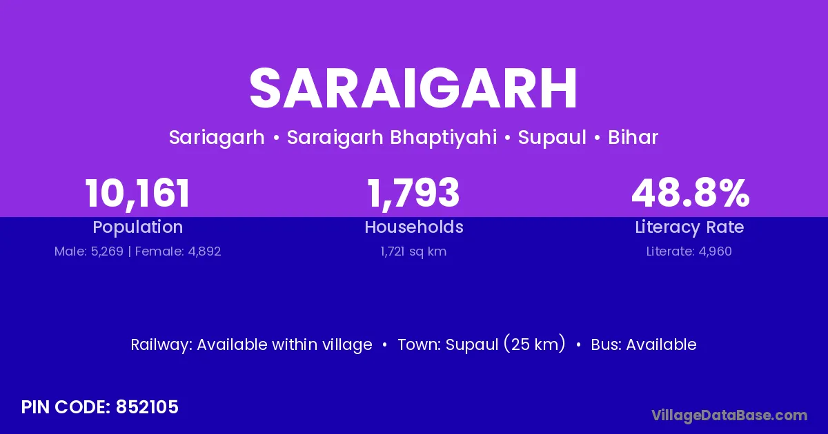Supaul (25 km) is the nearest town to Saraigarh village for major economic activities and is located approximately 25 km away.