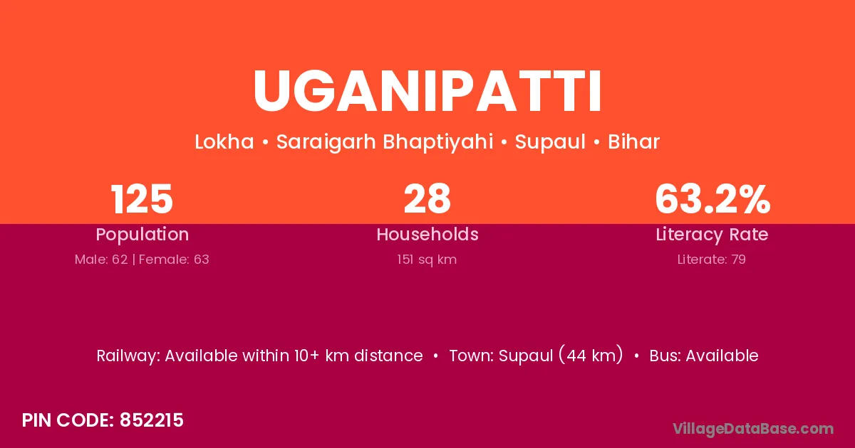 Supaul (44 km) is the nearest town to Uganipatti village for major economic activities and is located approximately 44 km away.