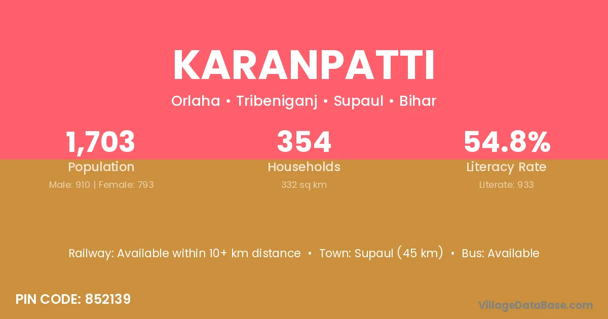 Supaul (45 km) is the nearest town to Karanpatti village for major economic activities and is located approximately 45 km away.