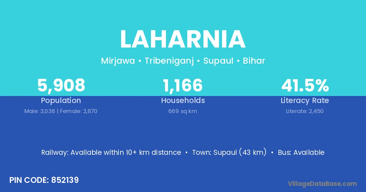 Supaul (43 km) is the nearest town to Laharnia village for major economic activities and is located approximately 43 km away.