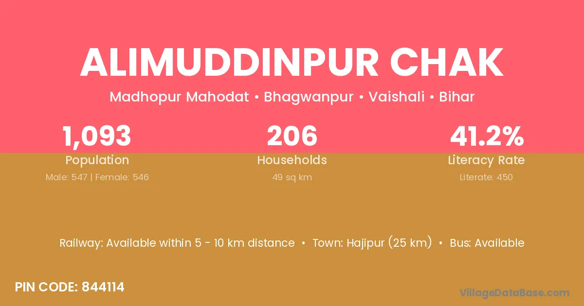 Hajipur (25 km) is the nearest town to Alimuddinpur Chak village for major economic activities and is located approximately 25 km away.