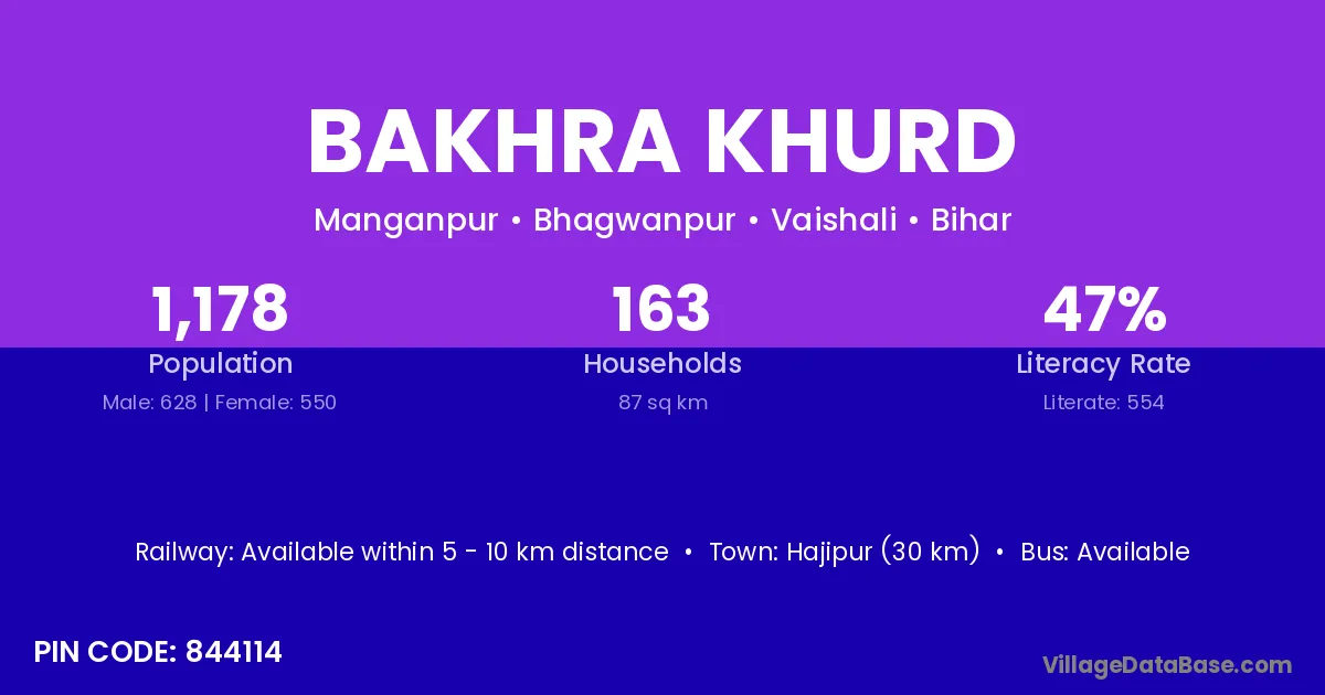Hajipur (30 km) is the nearest town to Bakhra Khurd village for major economic activities and is located approximately 30 km away.