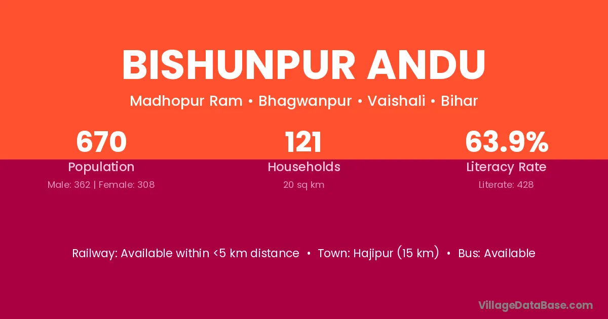 Hajipur (15 km) is the nearest town to Bishunpur Andu village for major economic activities and is located approximately 15 km away.