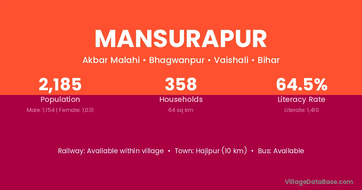 Hajipur (10 km) is the nearest town to Mansurapur village for major economic activities and is located approximately 10 km away.