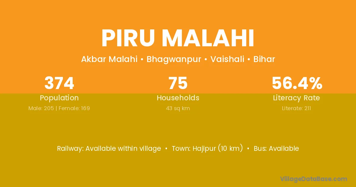 Hajipur (10 km) is the nearest town to Piru Malahi village for major economic activities and is located approximately 10 km away.