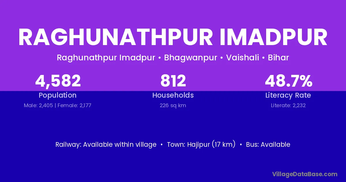 Hajipur (17 km) is the nearest town to Raghunathpur Imadpur village for major economic activities and is located approximately 17 km away.