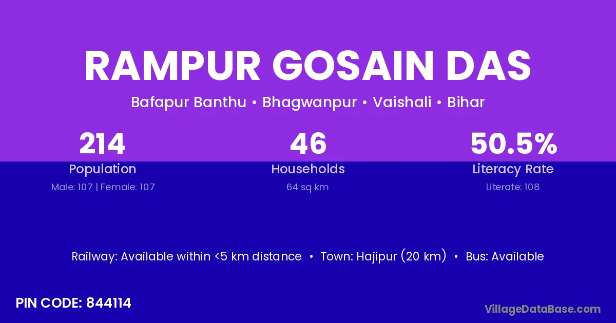 Hajipur (20 km) is the nearest town to Rampur Gosain Das village for major economic activities and is located approximately 20 km away.