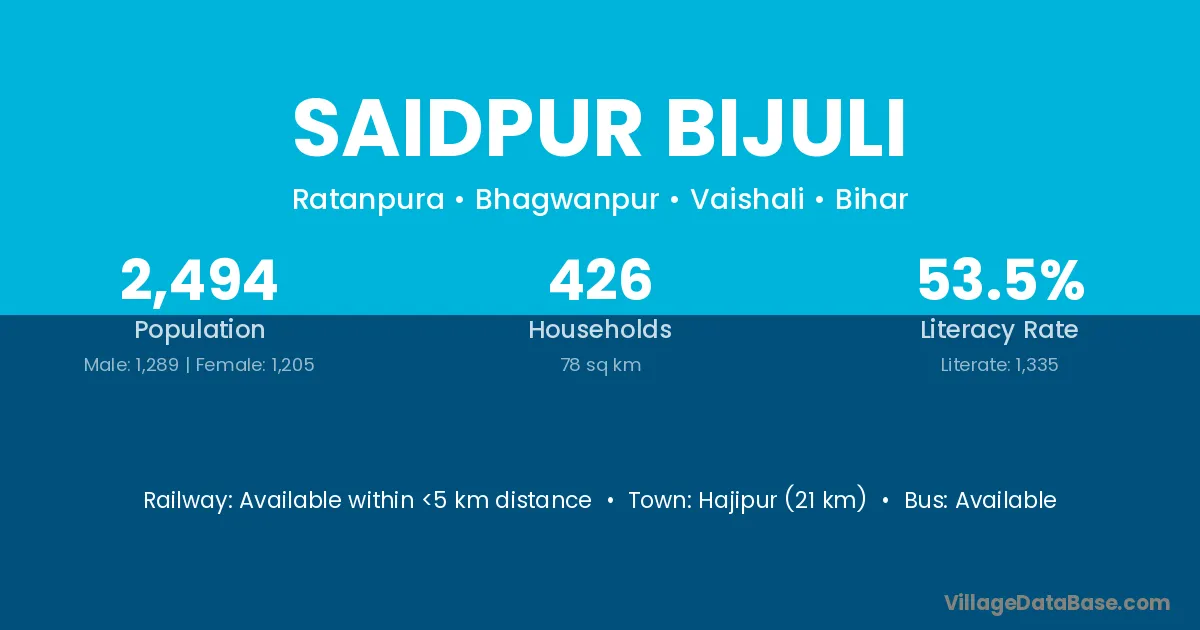 Hajipur (21 km) is the nearest town to Saidpur Bijuli village for major economic activities and is located approximately 21 km away.