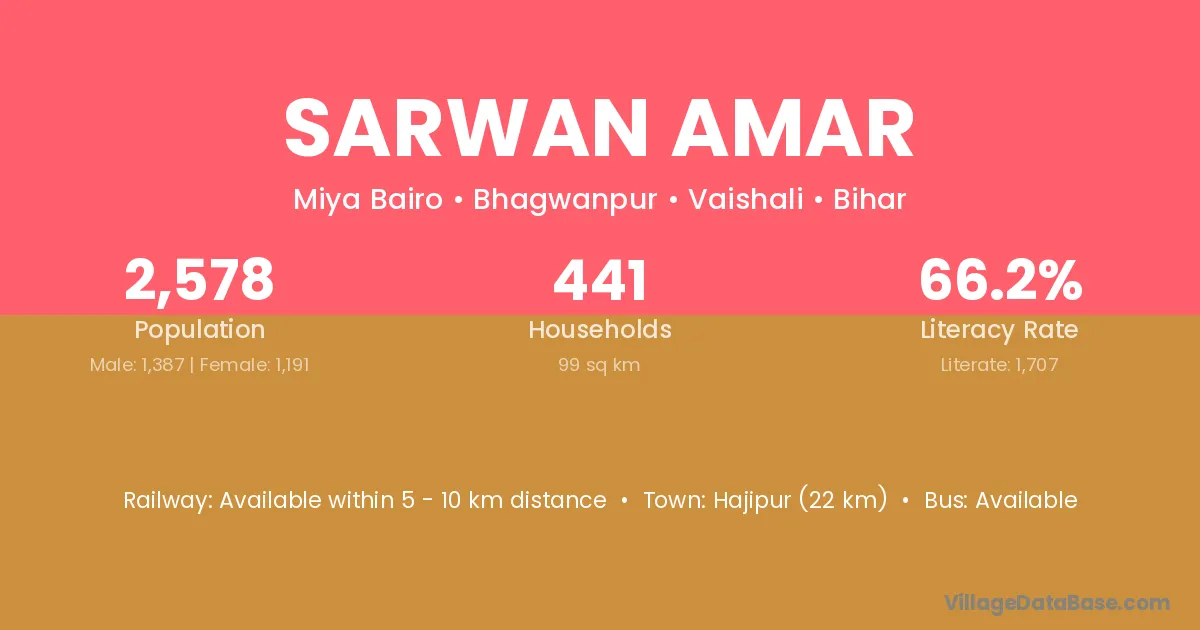 Hajipur (22 km) is the nearest town to Sarwan Amar village for major economic activities and is located approximately 22 km away.