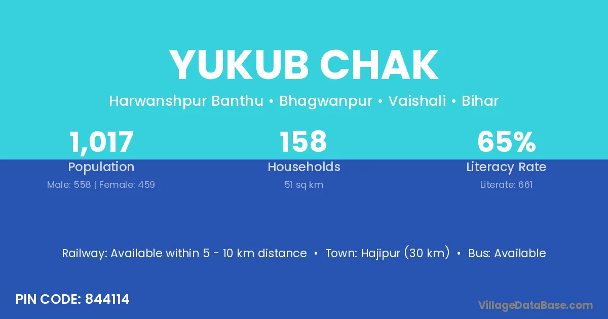 Hajipur (30 km) is the nearest town to Yukub Chak village for major economic activities and is located approximately 30 km away.