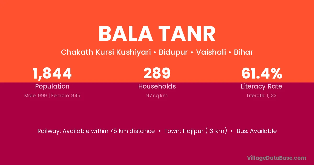 Hajipur (13 km) is the nearest town to Bala Tanr village for major economic activities and is located approximately 13 km away.