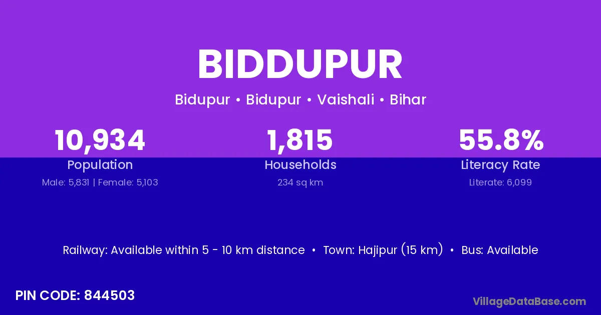 Hajipur (15 km) is the nearest town to Biddupur village for major economic activities and is located approximately 15 km away.