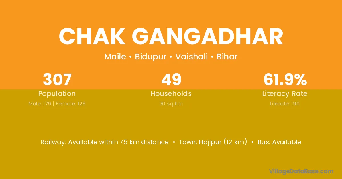Hajipur (12 km) is the nearest town to Chak Gangadhar village for major economic activities and is located approximately 12 km away.