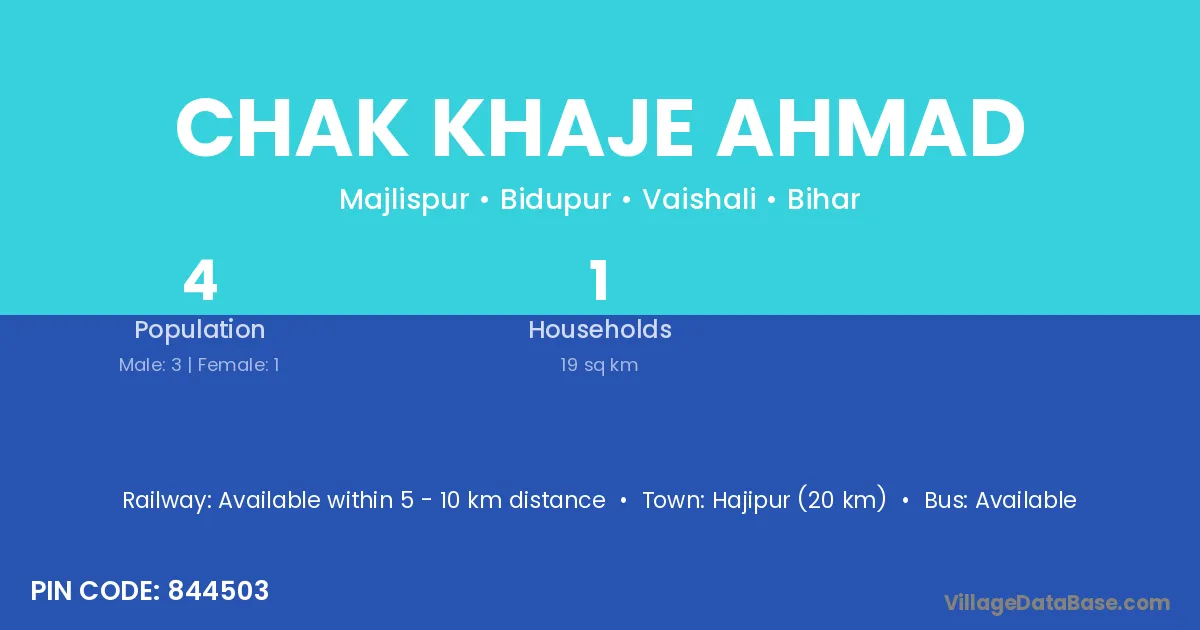 Hajipur (20 km) is the nearest town to Chak Khaje Ahmad village for major economic activities and is located approximately 20 km away.