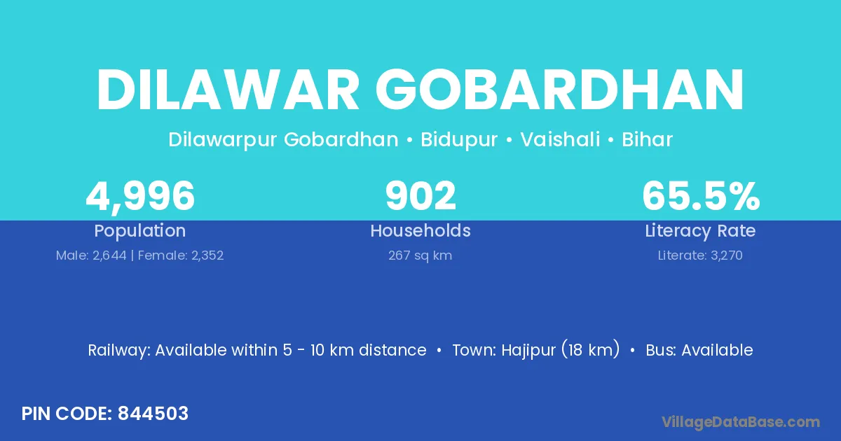 Hajipur (18 km) is the nearest town to Dilawar Gobardhan village for major economic activities and is located approximately 18 km away.