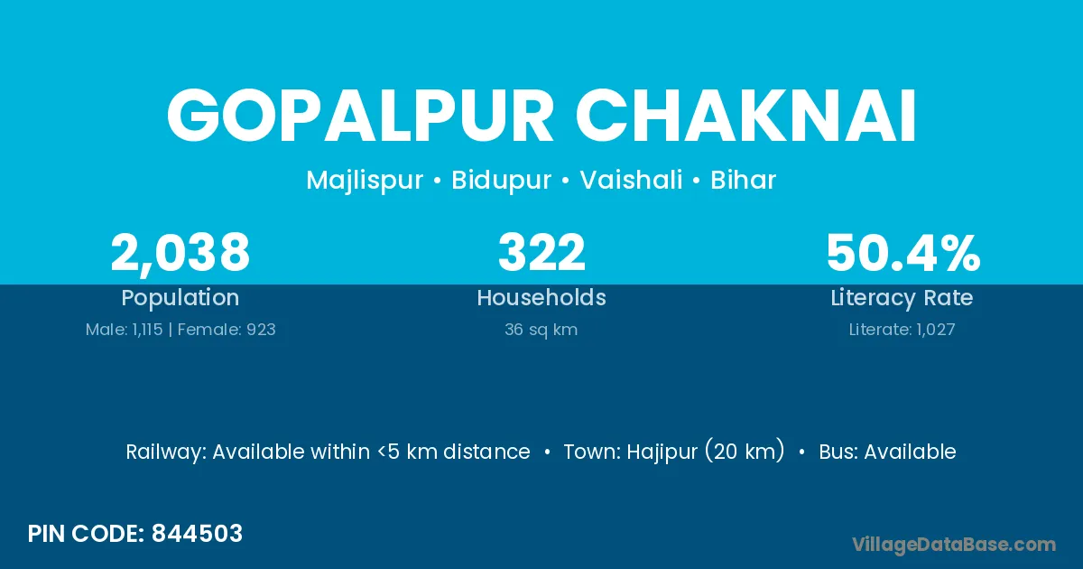 Hajipur (20 km) is the nearest town to Gopalpur Chaknai village for major economic activities and is located approximately 20 km away.