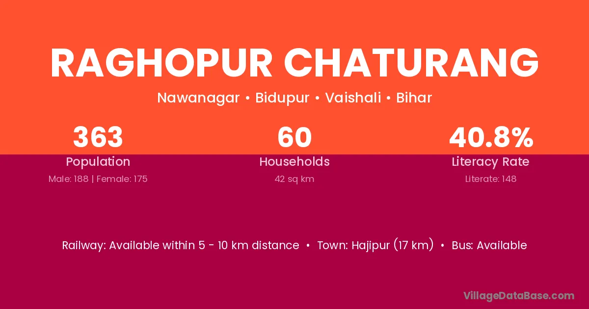 Hajipur (17 km) is the nearest town to Raghopur Chaturang village for major economic activities and is located approximately 17 km away.