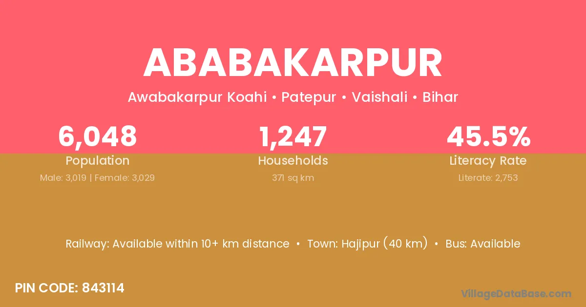 Hajipur (32 km) is the nearest town to Ababakarpur village for major economic activities and is located approximately 32 km away.