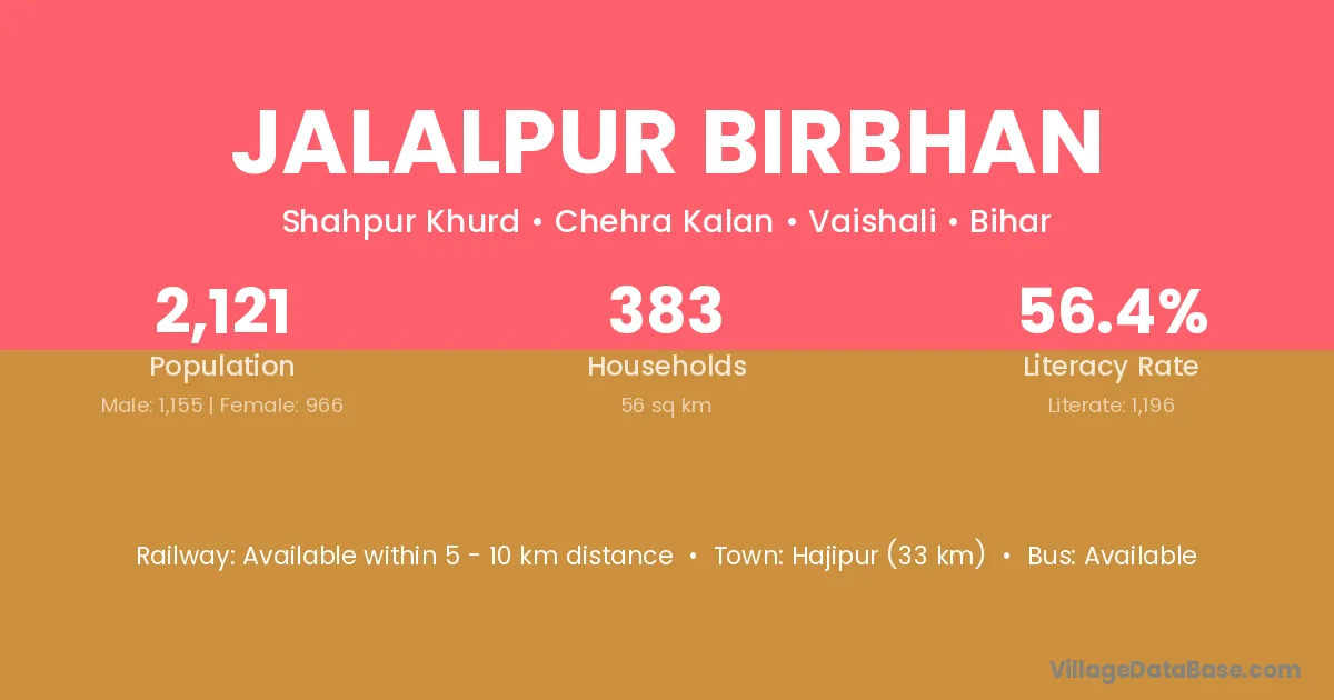 Hajipur (33 km) is the nearest town to Jalalpur Birbhan village for major economic activities and is located approximately 33 km away.