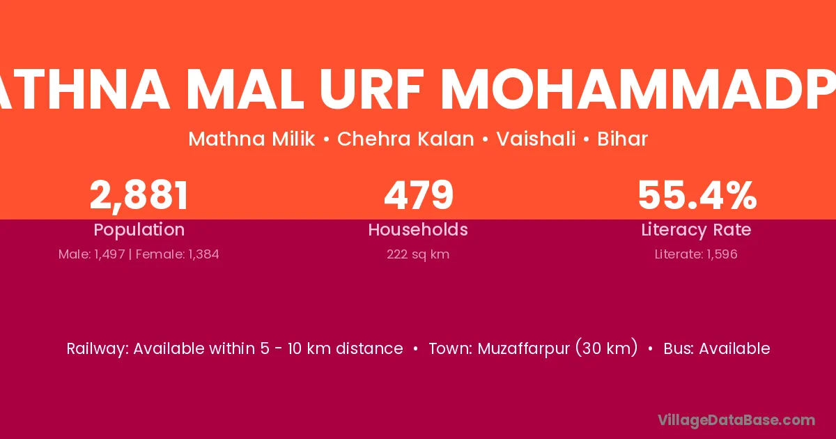 Muzaffarpur (30 km) is the nearest town to Mathna Mal Urf Mohammadpur village for major economic activities and is located approximately 30 km away.