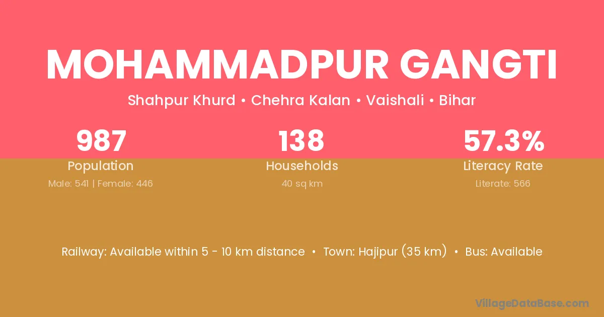 Mohammadpur Gangti village has a total population of 987 people, of which 541 are males and 446 are females.