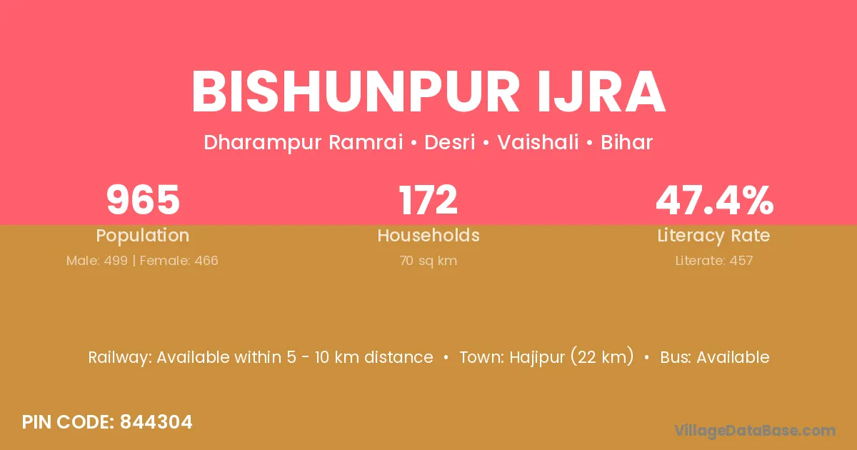 Hajipur (22 km) is the nearest town to Bishunpur Ijra village for major economic activities and is located approximately 22 km away.
